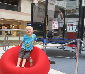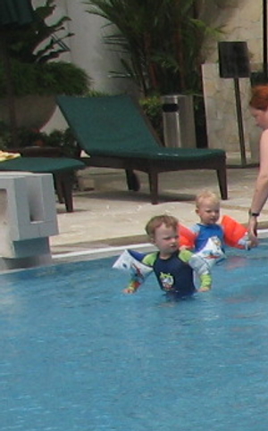 The apartment building also had a heated swimming pool and spa, so adorned with floaties we went down through the foyer to check it out. This proved to be a wonderful idea. The twins had not been swimming since March, and more exposure to the water was long overdue. Wiki was delighted to discover that he could now paddle short distances over deep water, and Loxon’s traditional reticence at all things containing more liquid than himself was firmly shaken at seeing how much fun Wiki was having. This was to prove a perfect preparation for swimming experiences in Singapore, Mannheim and Basel over the next month.